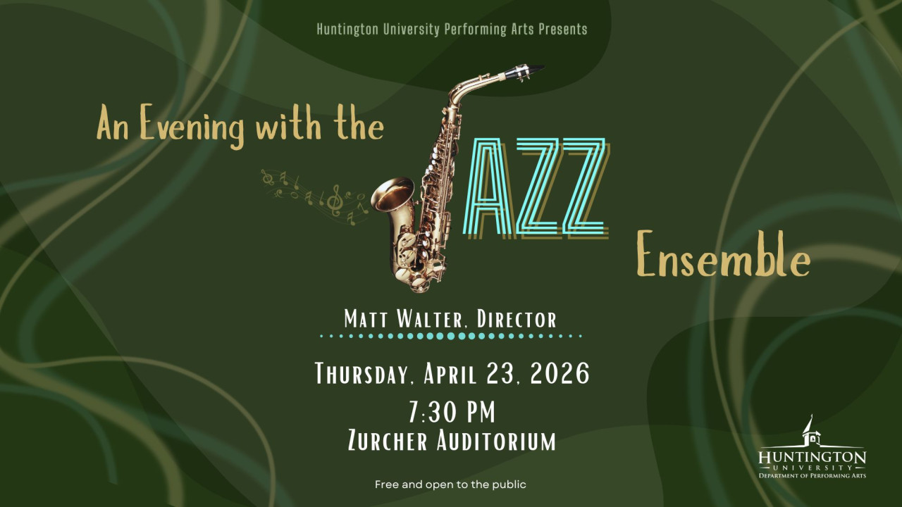 Join us for the Huntington University Jazz Band Concert on Thursday, April 23, 2026 at 7:30 PM in Zurcher Auditorium! Enjoy an evening of cool, smooth jazz featuring familiar favorites like "My Funny Valentine," "Some Day My Prince Will Come," and the iconic "Pink Panther," along with a few exciting surprises such as "Opus One," "My Dinner with Ronald," or "Struttin’ with Some Barbecue."